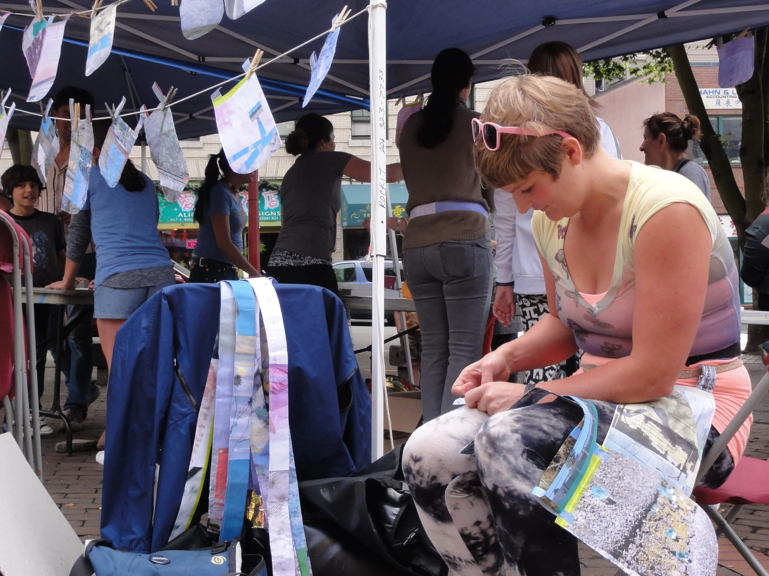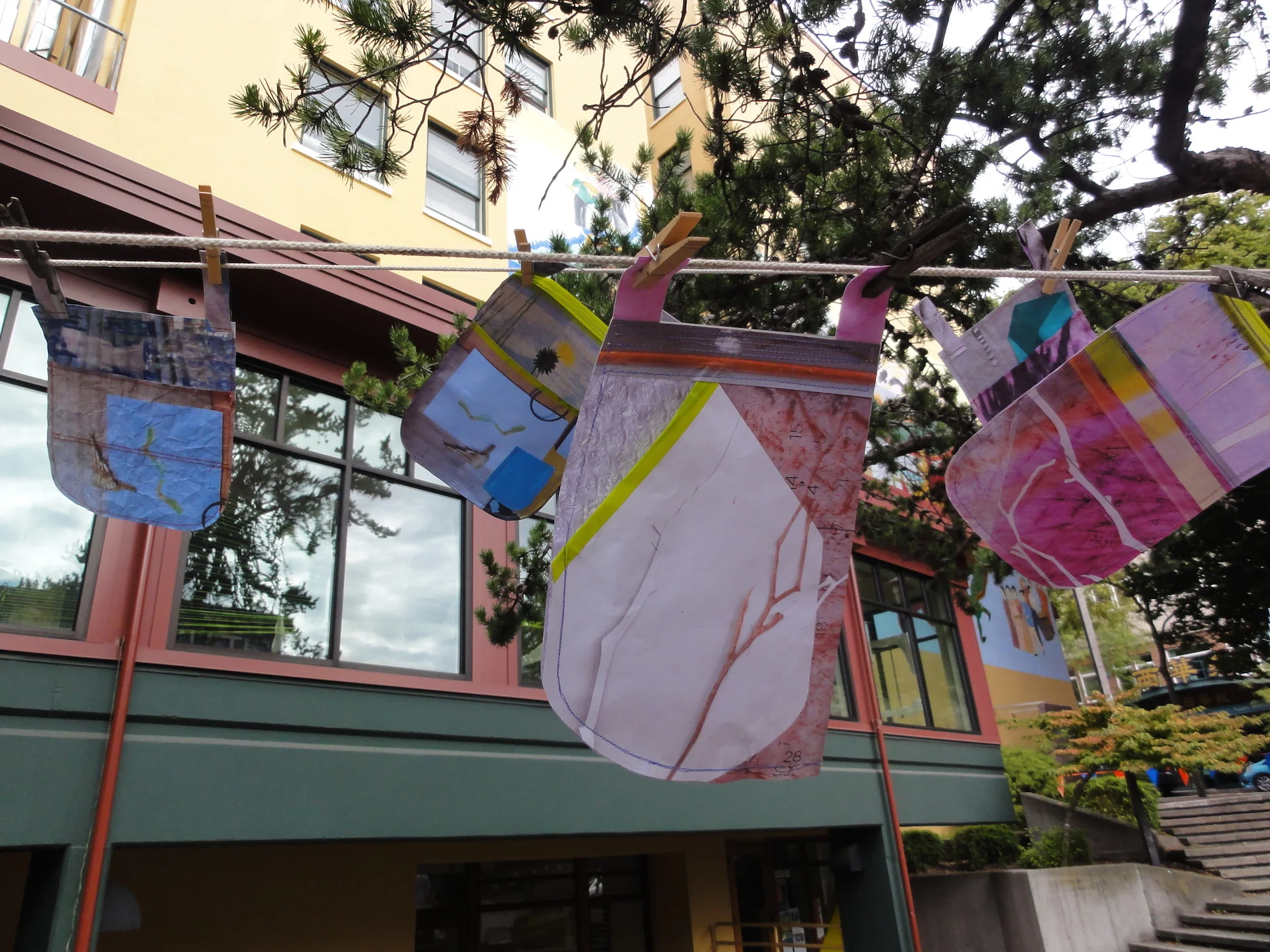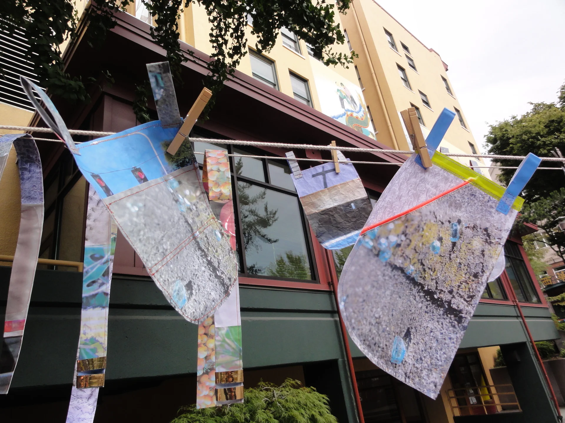 Accessories for the Journey is a collaboration with artist Kate Clark. It is a collection of 25 wearable pockets and belts, given to people to wear and use for collecting goods along the NEPO trail. The material for the pockets is made up of collage images gathered during several walks through Seattle’s International District and Beacon Hill, along the NEPO art trail.